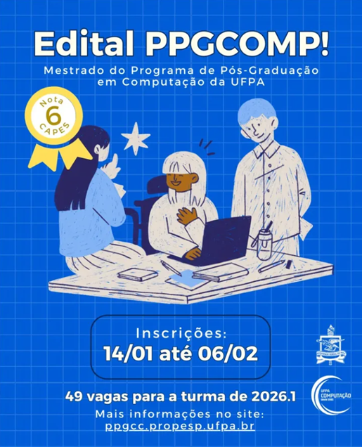 A Universidade Federal do Pará (UFPA), por intermédio de sua Pró-Reitoria de Pesquisa e Pós-Graduação (PROPESP), torna pública a abertura de inscrições e estabelecem as normas para o processo de seleção de candidatos para ingresso em 2026 no curso de mestrado e doutorado do Programa de Pós-Graduação em Computação (PPGCOMP) da UFPA, recomendado pela CAPES com a nota 6.